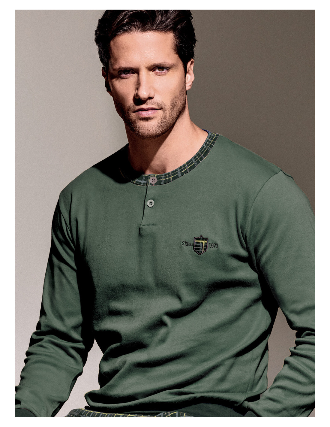 Pigiama manica lunga serafino con pantalone lungo polsi in interlock di cotone. Serie MOUNTAIN
