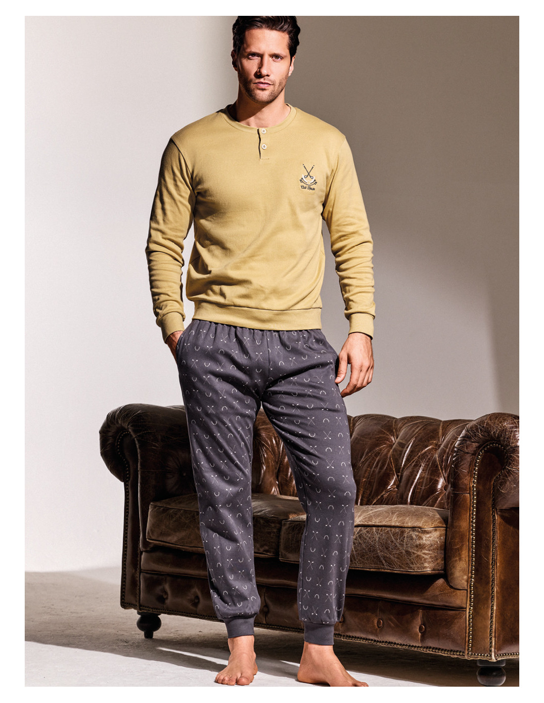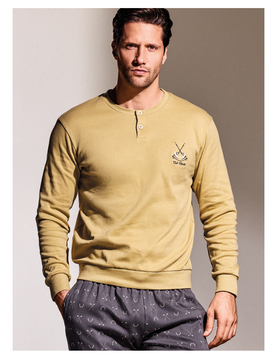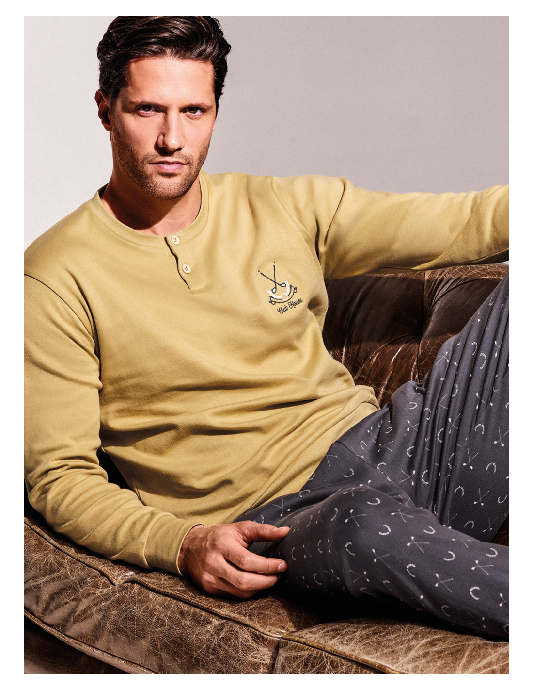 Pigiama manica lunga serafino con pantalone lungo polsi in interlock di cotone. Serie GOLF