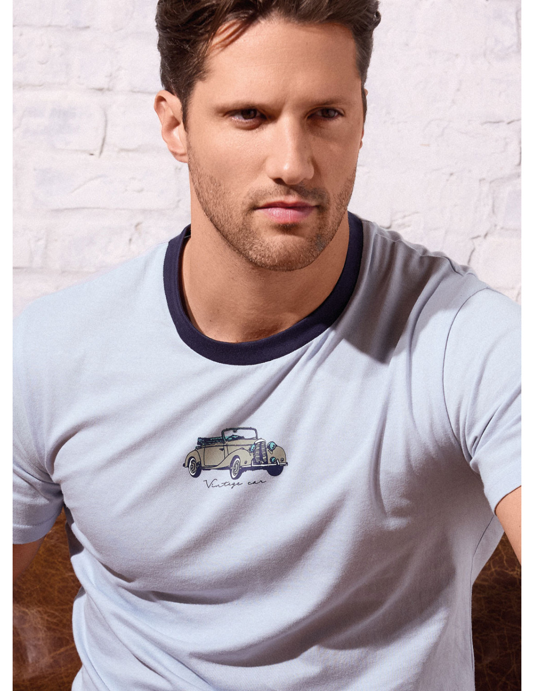 Pigiama serafino in jersey di cotone con mezza manica e pantalone corto micro fantasia auto d’epoca. Serie Vintage.