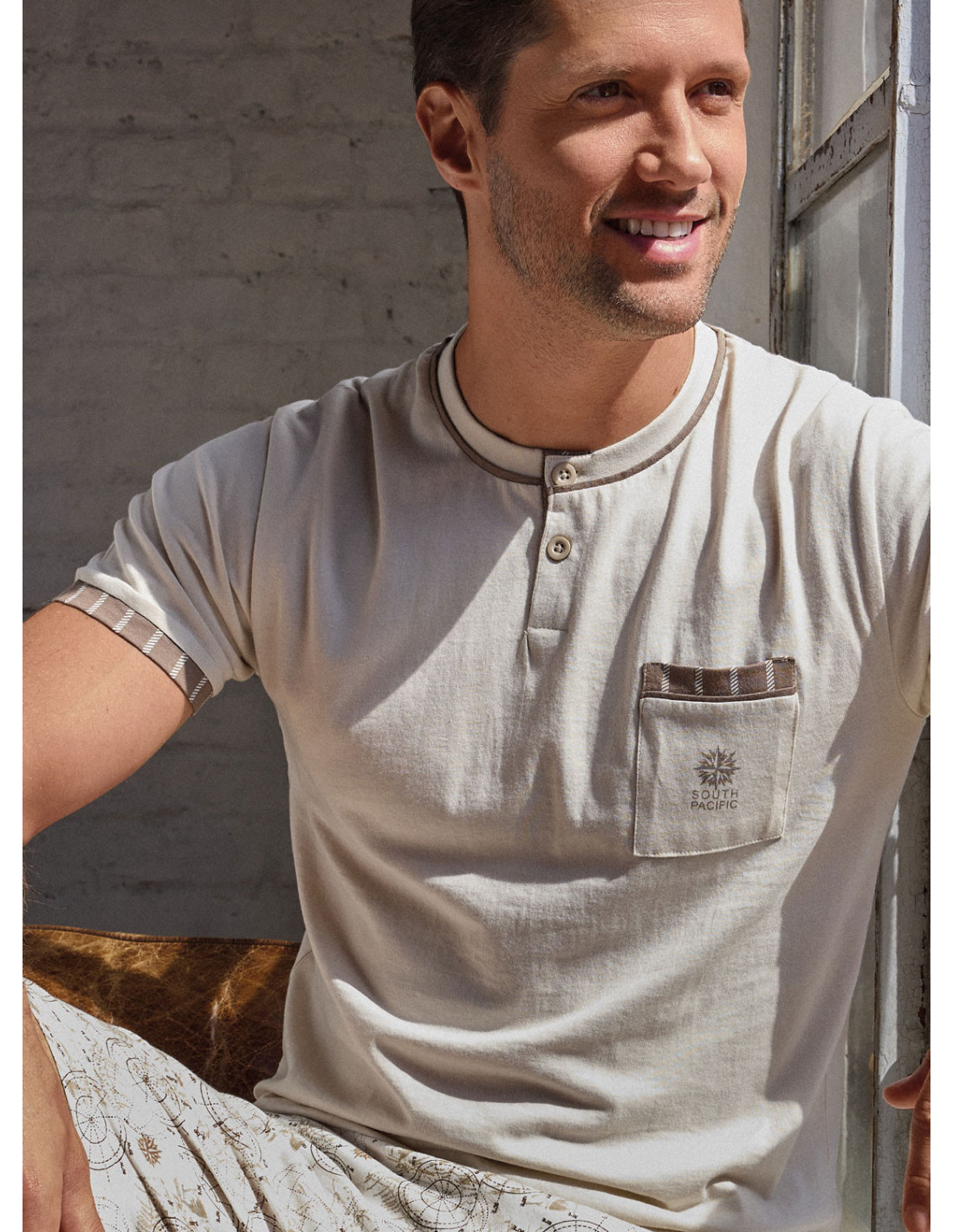 Il pigiama World Trip punta su un’estetica pulita e dettagli curati. La maglia serafino a mezza manica è minimal ma distintiva, con taschino applicato e finiture a contrasto che danno un tocco smart. Il pantalone corto stampato completa il set con un mood travel contemporaneo, ideale per la primavera/estate. Jersey di cotone morbido e traspirante, perfetto per comfort e stile anche a casa.