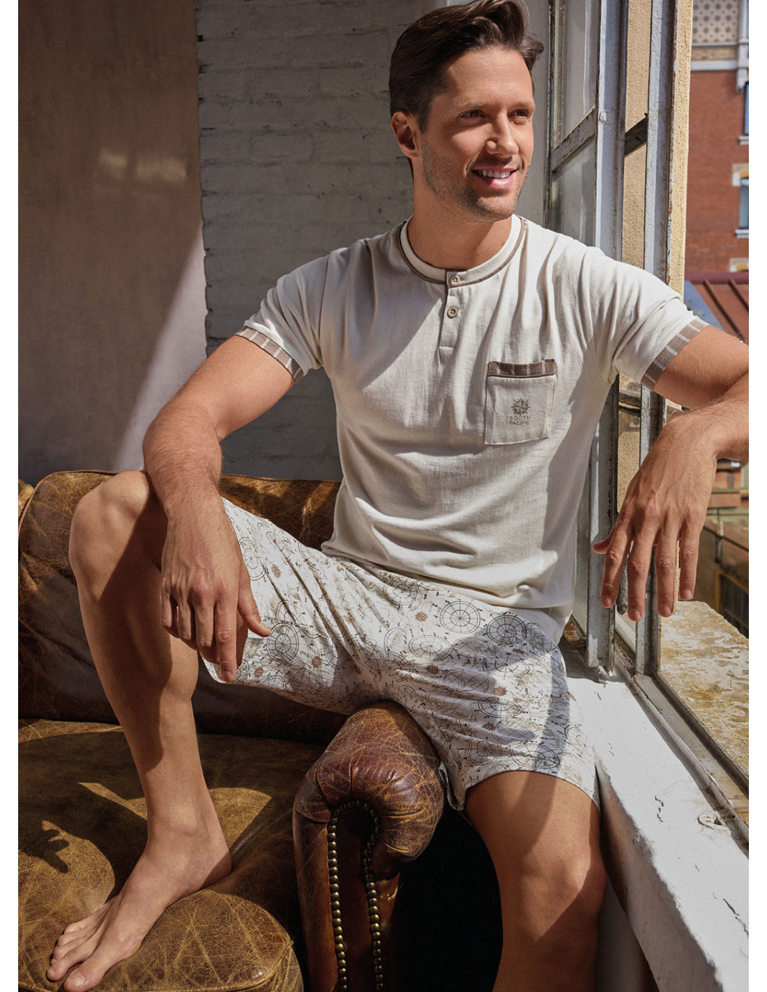 Pigiama serafino in stile nightwear con maglia a mezza manica in jersey di cotone e pantalone corto. Serie World Trip.