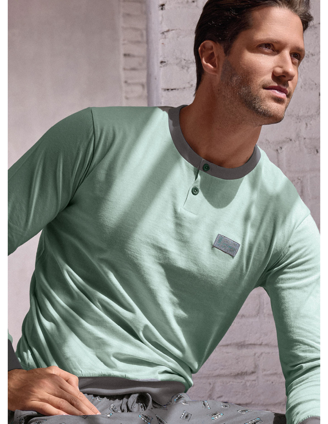 Pigiama serafino manica lunga e pantalone lungo con polsi, jersey di cotone, maglia tinta unita con dettagli a contrasto e pantalone fantasia all over. Serie Music Play.