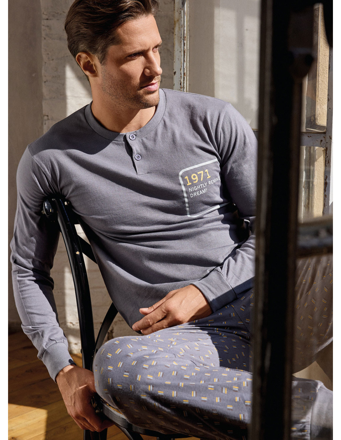 Essenziale, moderno, confortevole: il pigiama uomo Serie MIKADO è realizzato in jersey di cotone per una sensazione morbida e piacevole sulla pelle. La maglia serafino manica lunga ha una linea pulita con abbottonatura al collo e una stampa posizionata sul petto che aggiunge carattere in modo discreto. Il pantalone lungo con fantasia all over completa l’insieme con un look contemporaneo, mentre i polsi al fondo assicurano una vestibilità pratica e ordinata, perfetta per relax e notte.