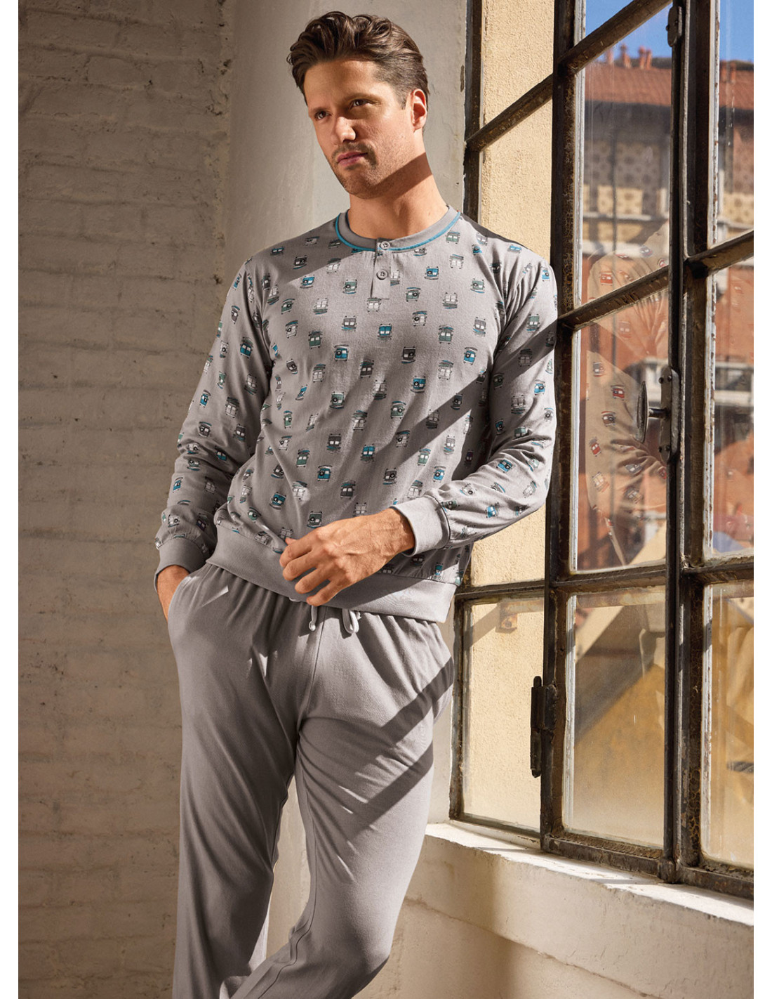 Pigiama serafino manica lunga e pantalone lungo con polsi, jersey di cotone, maglia fantasia all over e pantalone tinta unita. Serie GO SURF.