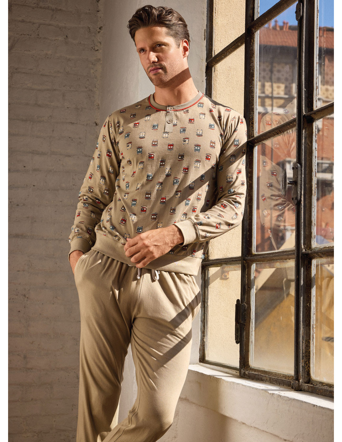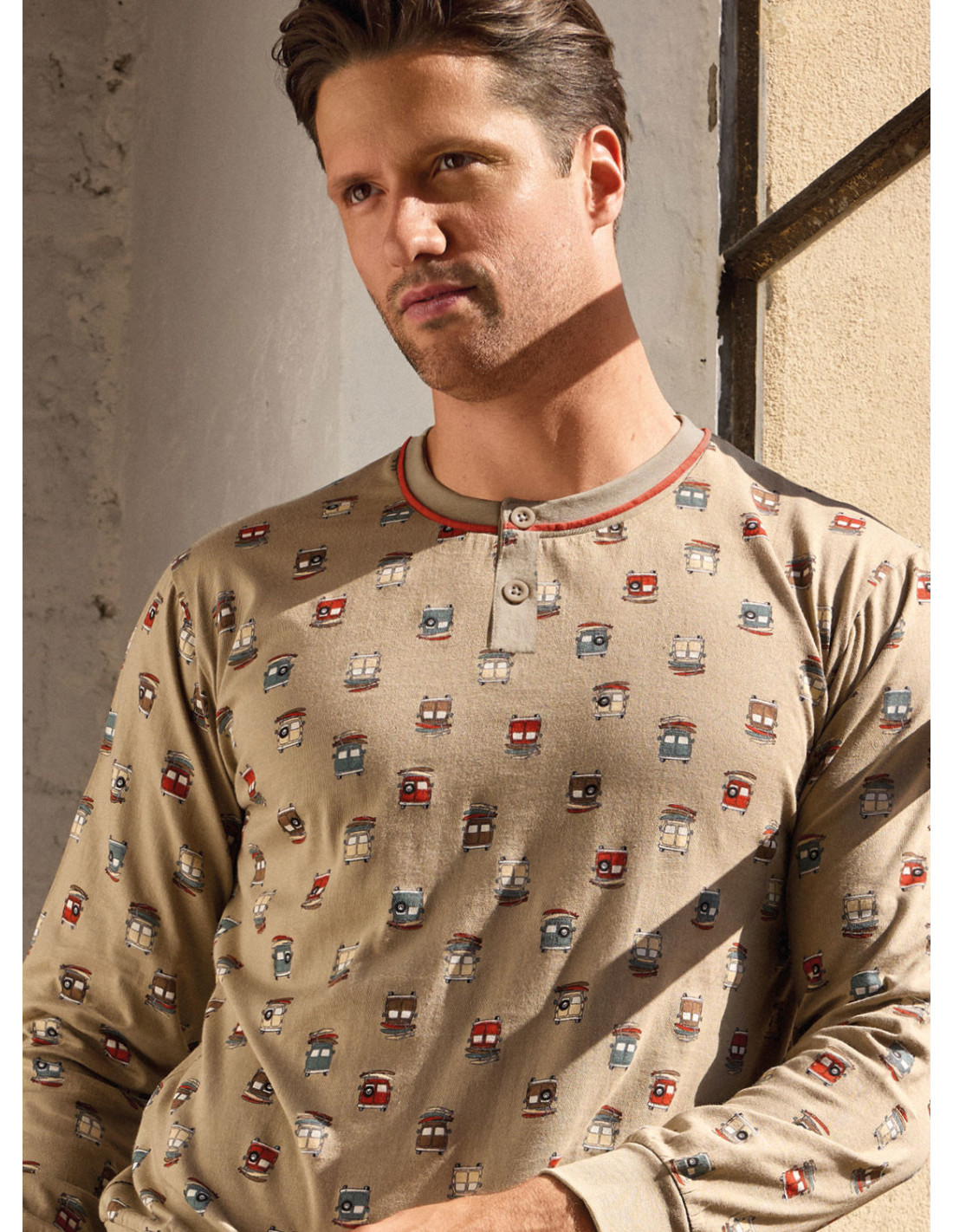 Pigiama serafino manica lunga e pantalone lungo con polsi, jersey di cotone, maglia fantasia all over e pantalone tinta unita. Serie GO SURF.