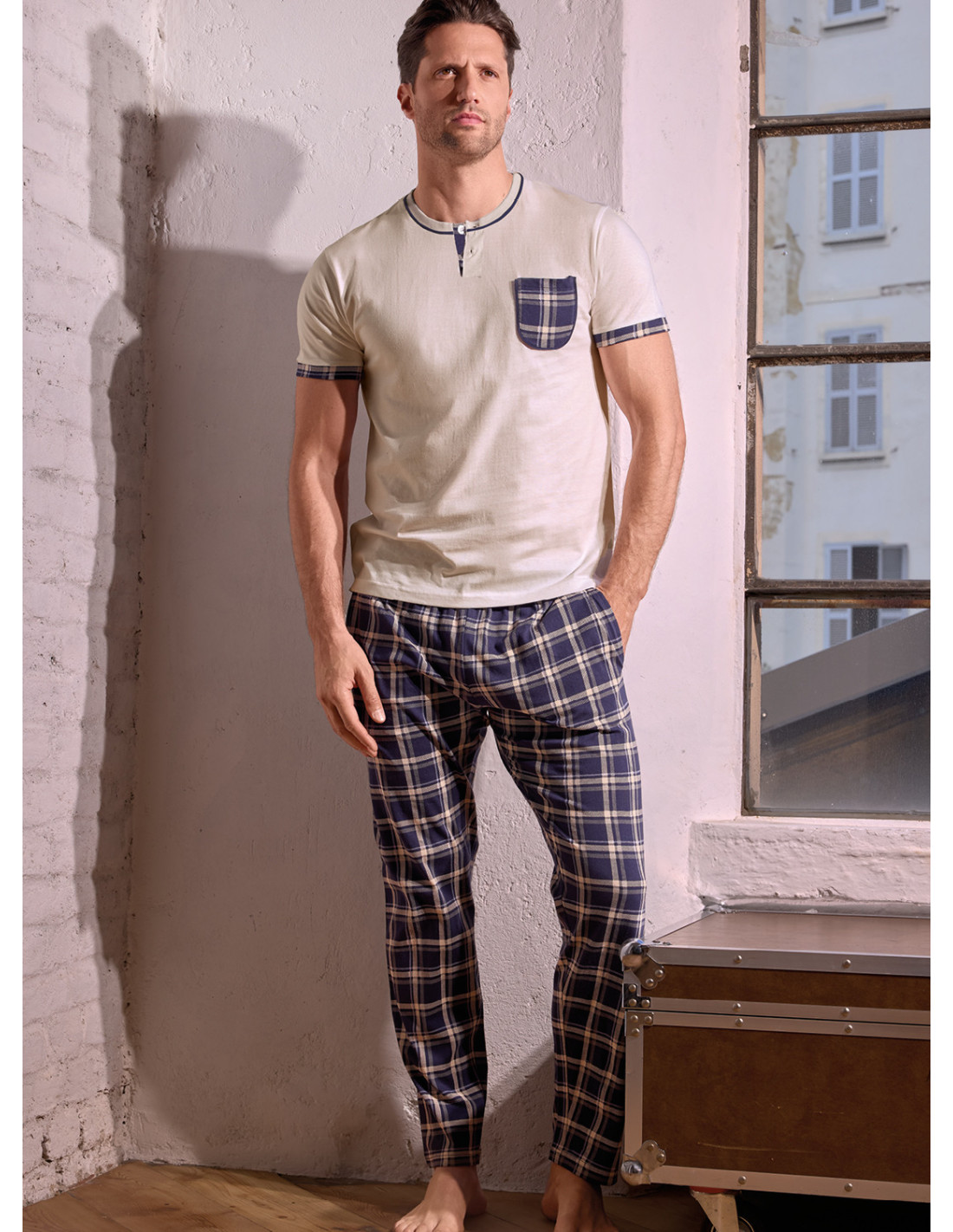 Il pigiama Chilling interpreta lo stile casual con un taglio pulito e dettagli a contrasto. La maglia serafino a manica lunga è in tinta unita con profili rifiniti e taschino in fantasia check, per un tocco grafico discreto ma riconoscibile. Il pantalone lungo in fantasia check completa il set con una vestibilità comoda e ordinata. Jersey di cotone morbido e traspirante, ideale per il comfort quotidiano.