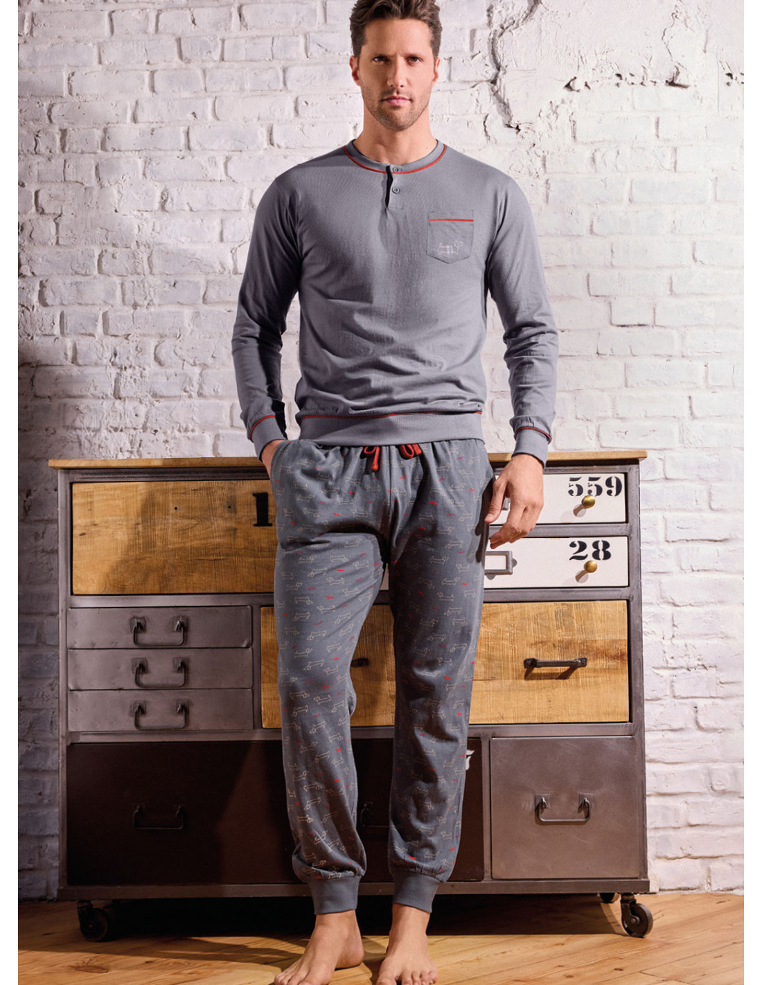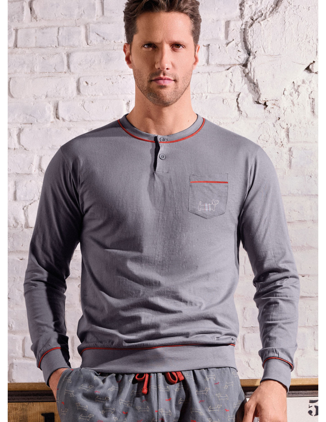 Il pigiama Play Dog è pensato per chi vuole comfort quotidiano con un look curato. La maglia serafino a manica lunga è in tinta unita con profili a contrasto e taschino sul petto, per un dettaglio grafico essenziale. Il pantalone lungo in fantasia all over, con polsi sul fondo, completa il set con una vestibilità pratica e ordinata. Jersey di cotone morbido e traspirante, ideale per la routine di ogni giorno.