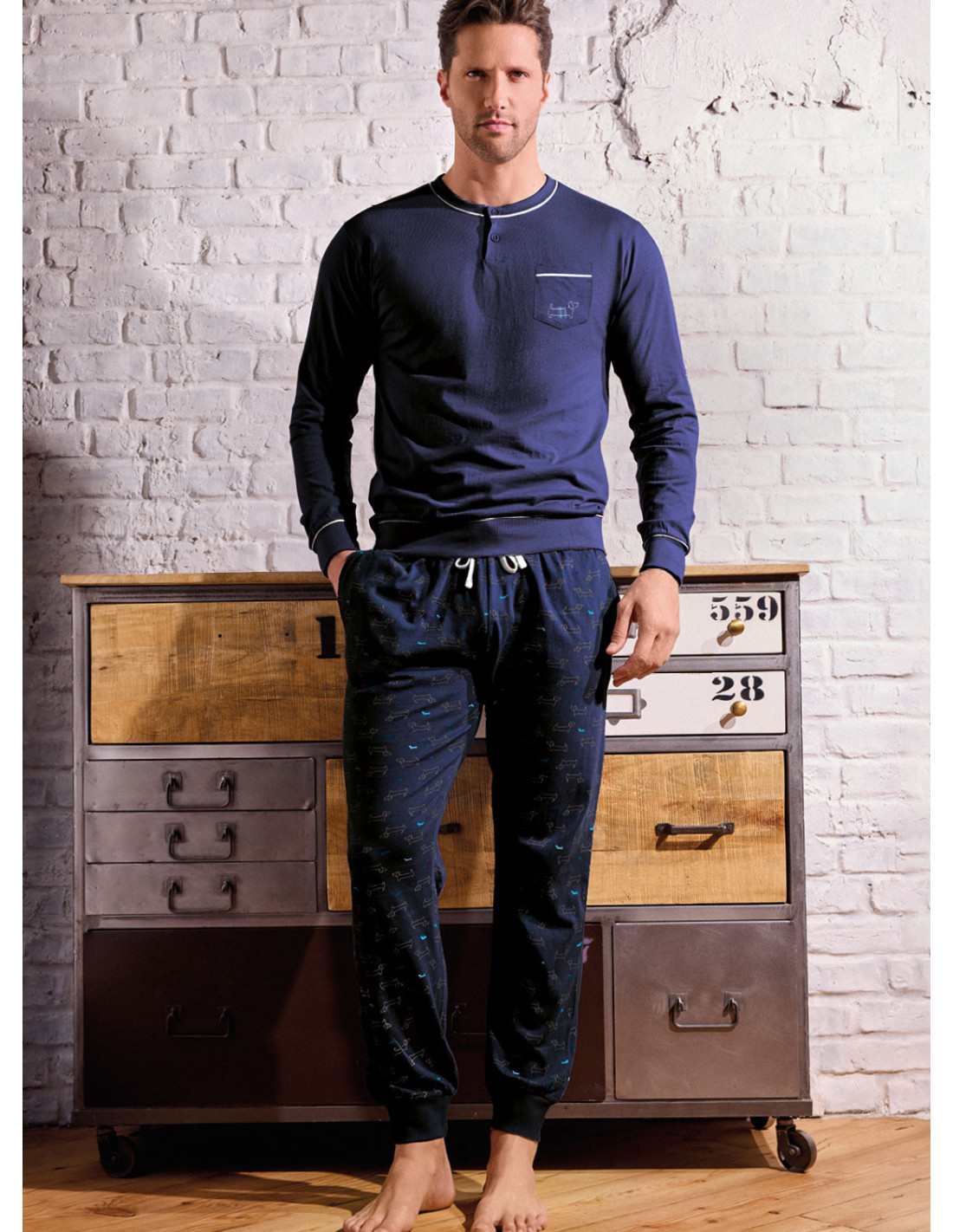 Pigiama serafino in jersey di cotone con manica lunga e pantalone lungo con polsi. Serie Play Dog.