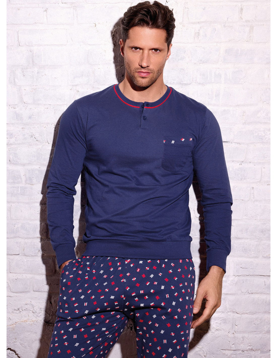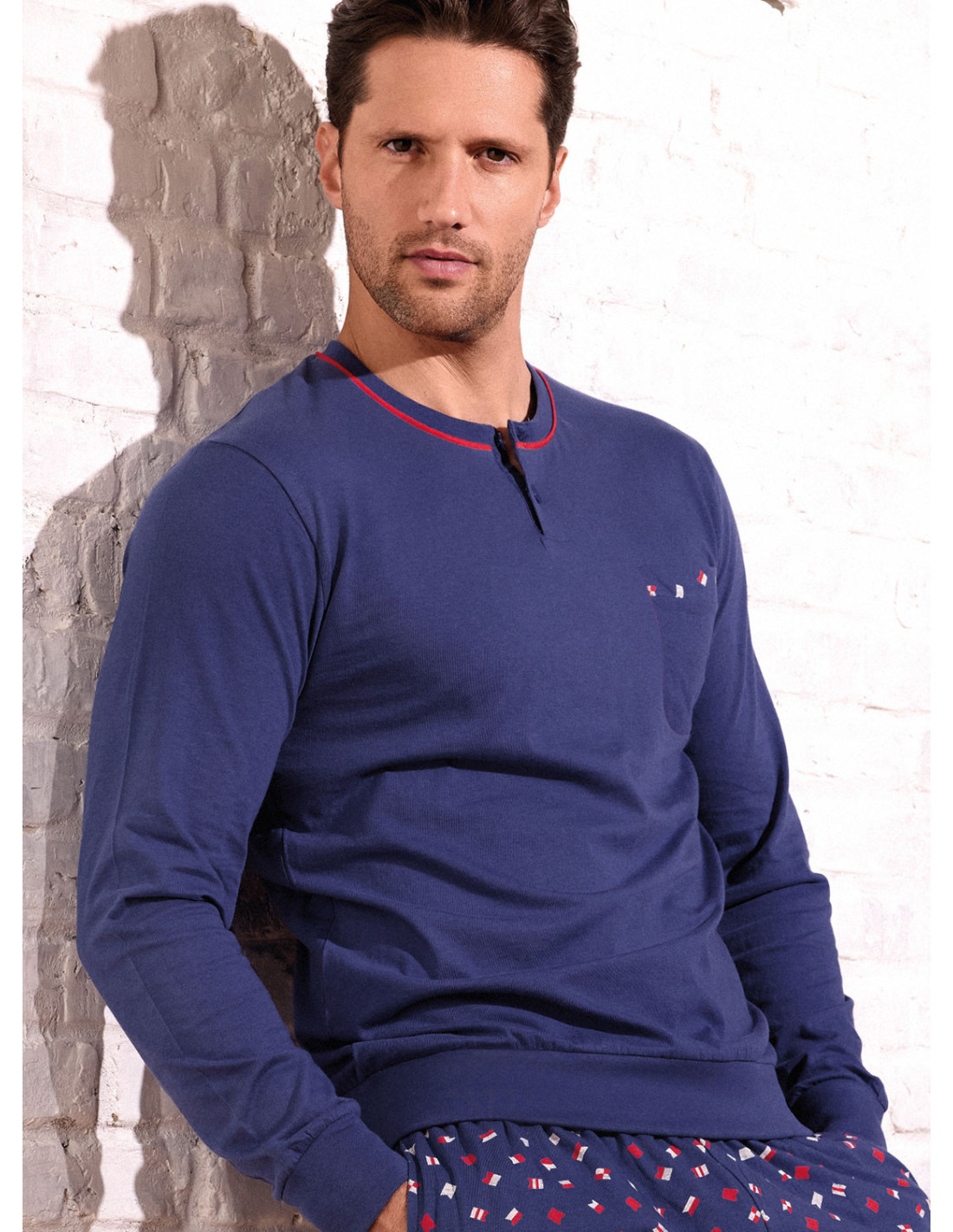 Pigiama serafino manica lunga e pantalone lungo con polsi, jersey di cotone, maglia tinta unita con dettagli a contrasto e pantalone fantasia all over. Serie Desert.